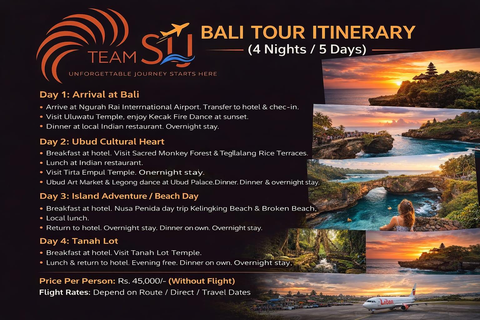Discover the beauty of Bali with our 4 Nights / 5 Days tour package by Team STJ. Explore iconic attractions like Uluwatu Temple, Ubud, Nusa Penida, and Tanah Lot Temple. Enjoy stunning sunsets, cultural experiences, island adventures, and breathtaking landscapes — perfect for couples, families, and groups.