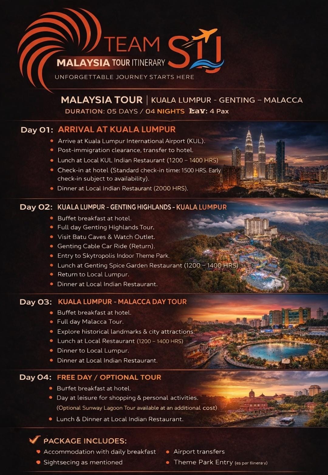Explore the iconic skyline of Kuala Lumpur, enjoy a scenic cable car ride in Genting Highlands with theme park fun at Skytropolis, and step back in time through the historical streets of Malacca. With comfortable hotel stays, daily breakfast, airport transfers, and guided sightseeing included, this package ensures a hassle-free and memorable vacation.